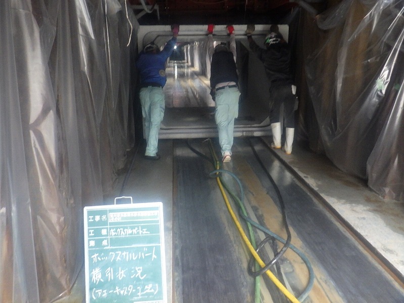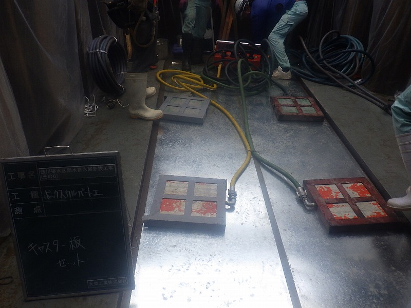 あとは、エアーバックに空気を送り込むと、エアーバックが膨らみ、ボックスカルバートが少し上がれば3人の力で、6.8tのボックスカルバートを押して設置場所まで、移動し設置します。