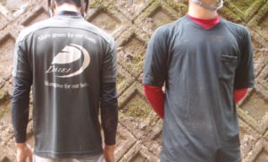 速乾性のアンダーシャツの上に、速乾性のTシャツ(社名入り)を着て作業します。けが等、防止のため長袖を着用します。