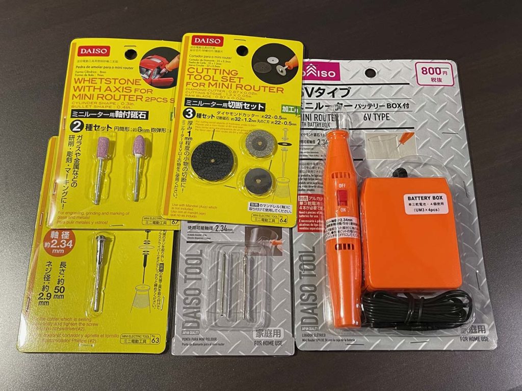 「切る、削る」には何が必要かと考え、ミニルーターが使えるんじゃないかとネットで見たものの安いので3,000円ぐらい。ただダイソーにもミニルーターが売ってあるらしいとのネット情報からダイソーへ。
