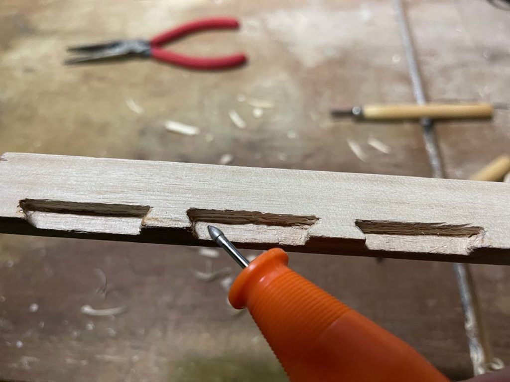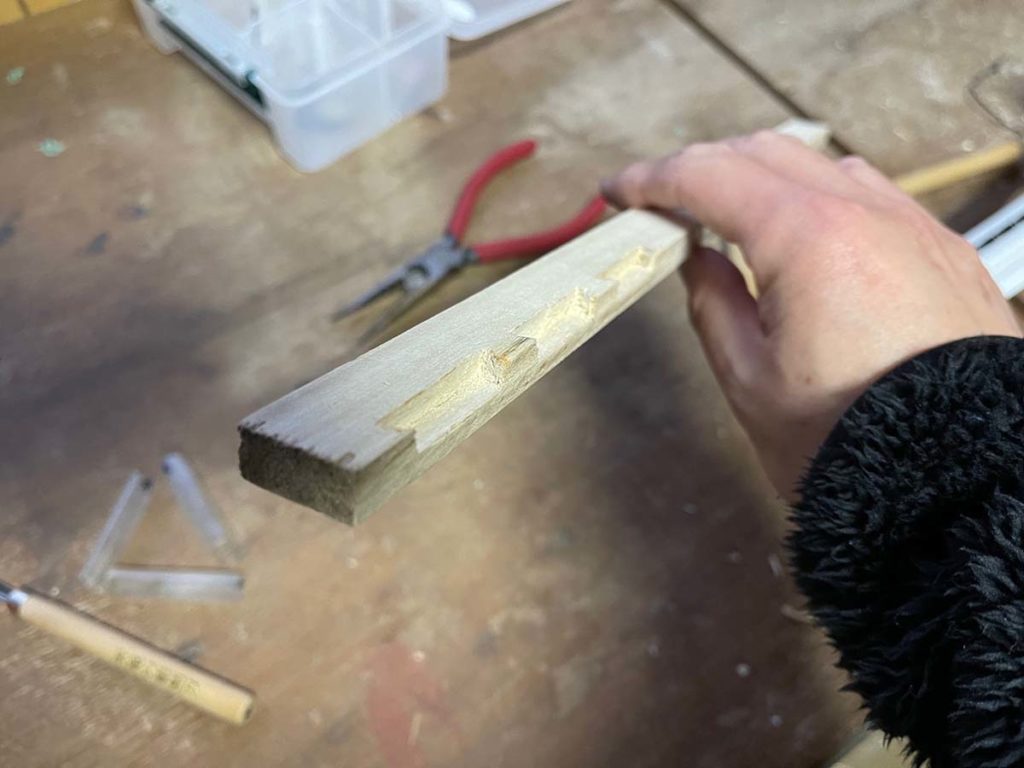 とせっかく買ったミニルーターを置いといて、彫刻刀で削り出し。