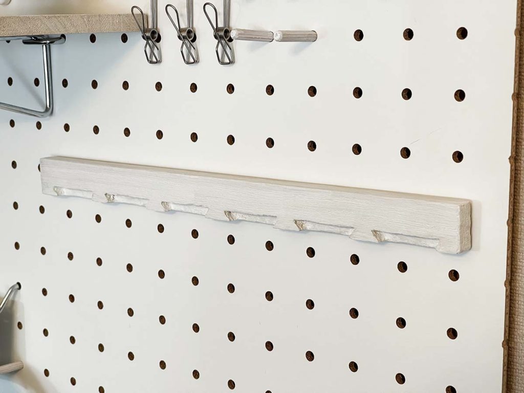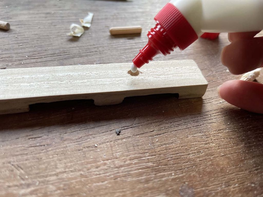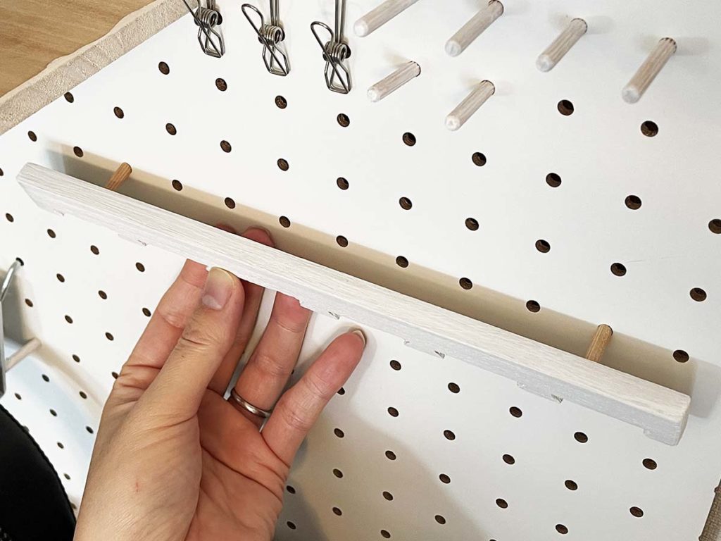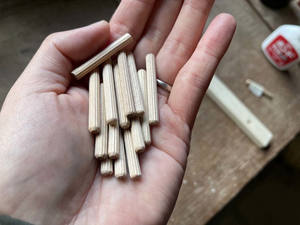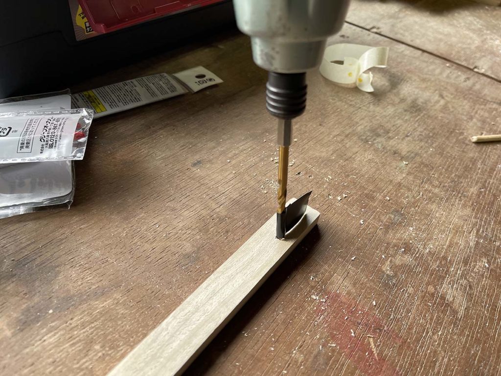 一応有孔ボードに取り付けるため背面に穴をあけて木ダボを取付。この木ダボもダイソーの有孔ボード用を使用しました。
