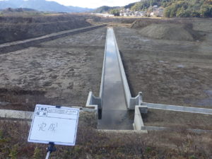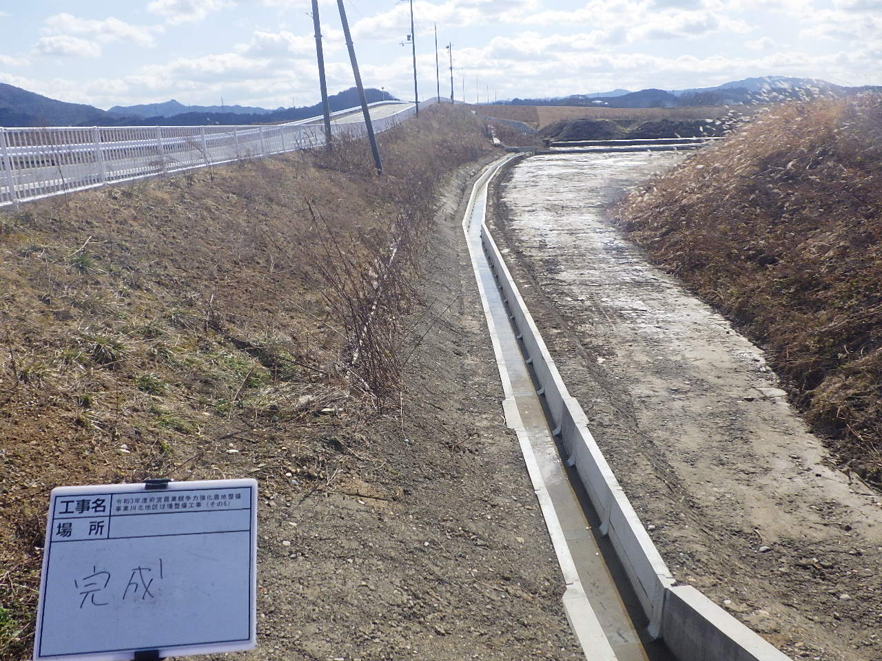 工事内容ですが、田畑の表土・基盤土を剝ぎ取り及び客土の運搬後、現場打水路・柵渠を設置する工事を行いました。