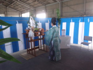 弊社は、既存の工場を法規に適合するよう改修工事、製造機械を設置するための補強工事、電気設備工事等を施工させて頂く事となり、工事期間中の安全だけでなく稼働してからの安全も併せて安全祈願祭のお手伝いをさせていただきました。