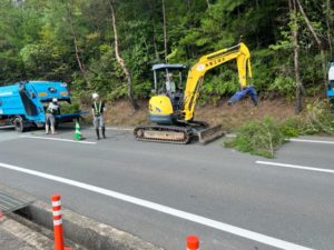 それを解消するため、道路に飛び出した枝を道路横の水路から垂直に約5mほど枝打ちする作業です。