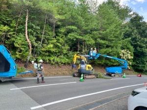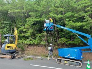 高いところは高所作業車に乗って、人力で切り取って行きます。
