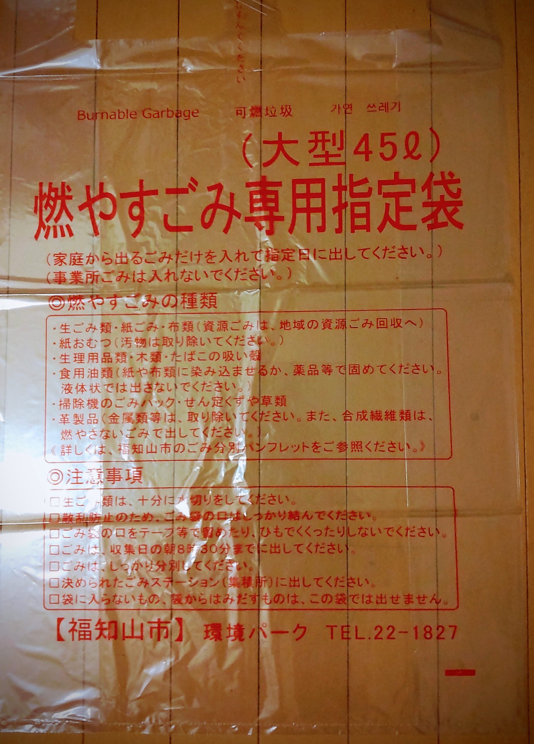 福知山市では、上の図のように指定されたゴミ袋がありますこのゴミ袋に発泡スチロールを入れて出して下さい。[汚れている物はダメです]