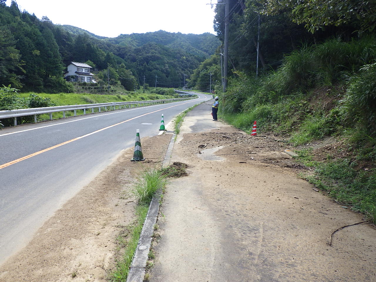 山からの水で歩道、車道まで土砂が流れ込み一時は路面が冠水状態になっていました!