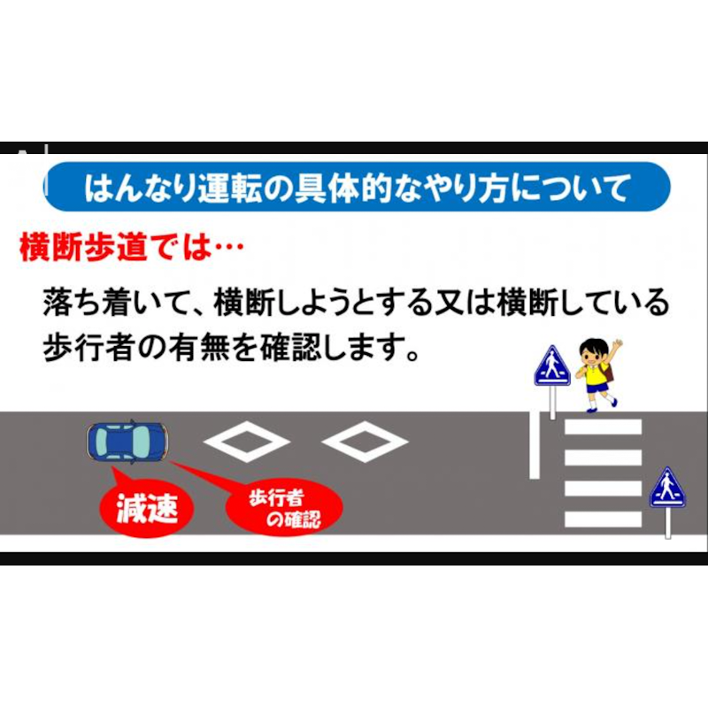 歩行者が横断を終えるまで、見守ります。 すべての、ドライバーが心にゆとりを持って歩行者を守るためにはんなり運転に心がけましょう。以上て終わります。