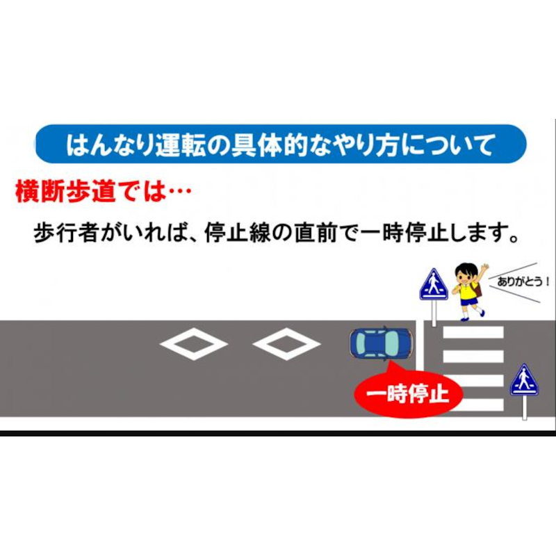 皆さんご存知ですか?信号機のない横断歩道での車の停止率(全国平均39.8%)全国的にも少ないですが、京都府はこれよりさらに低い23.5%都道府県でワースト3位と不名誉結果です。 そこで、京都府は、横断歩道での歩行者優先「はんなり運転」を心掛けましょう!はんなり運転とは横断歩道における歩行者優先義務の遵守はもとより、「落ち着いて歩行者を保護する」という他の運転者の模範となる運転を言います。