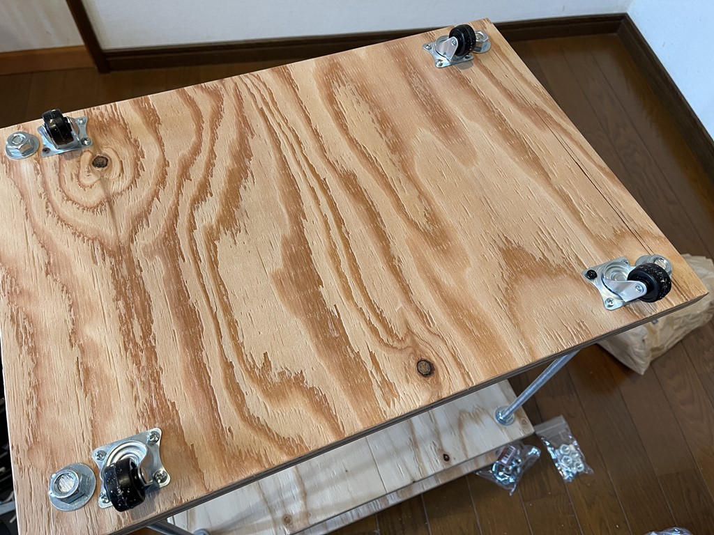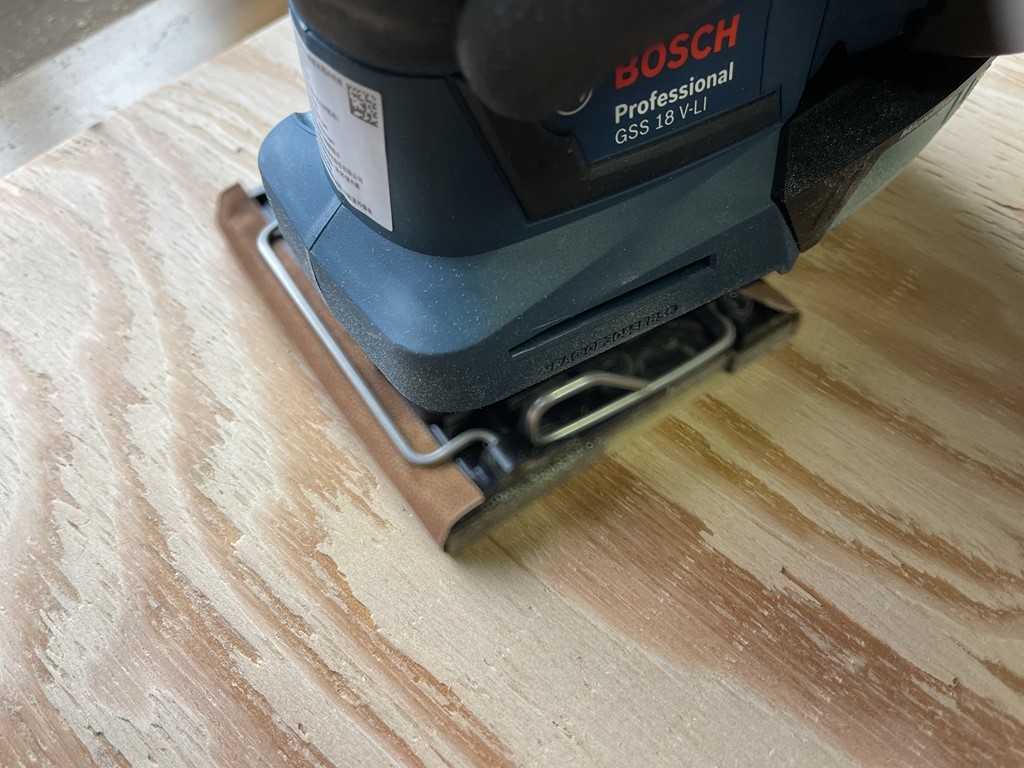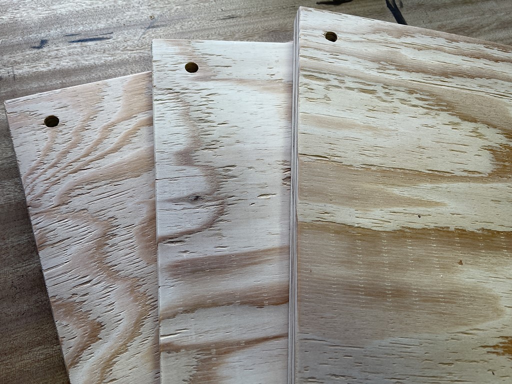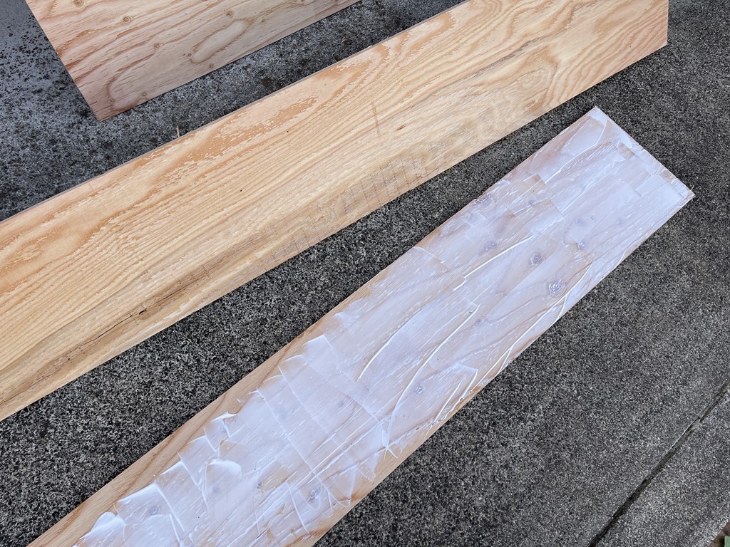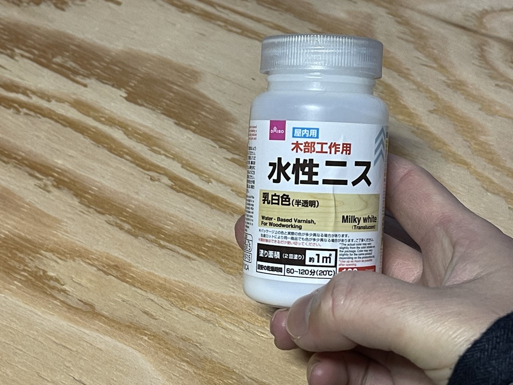 サンダーで表面を研磨し、ダイソーのニスを塗って棚板を仕上げていきます。