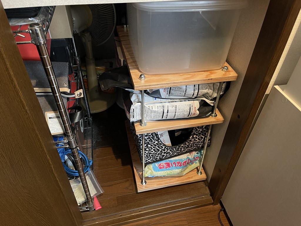 以前から押入の猫用品置場がごちゃごちゃしていて棚が欲しいと思っていたので、とりあえず持って帰ってきた合板を使い棚が作れないかネット検索。