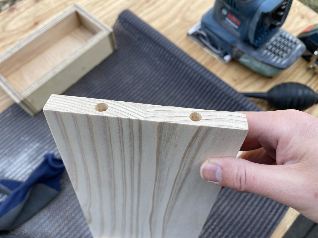 パーツをある程度サンダーで研磨してから背板と上下部分を接続するのですが、色をツートンにしたいので一端ダボで繋いで形にしてから再度研磨。