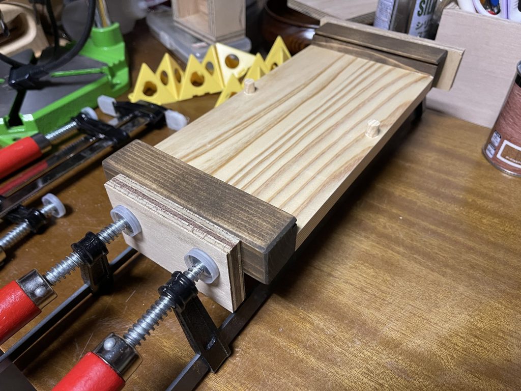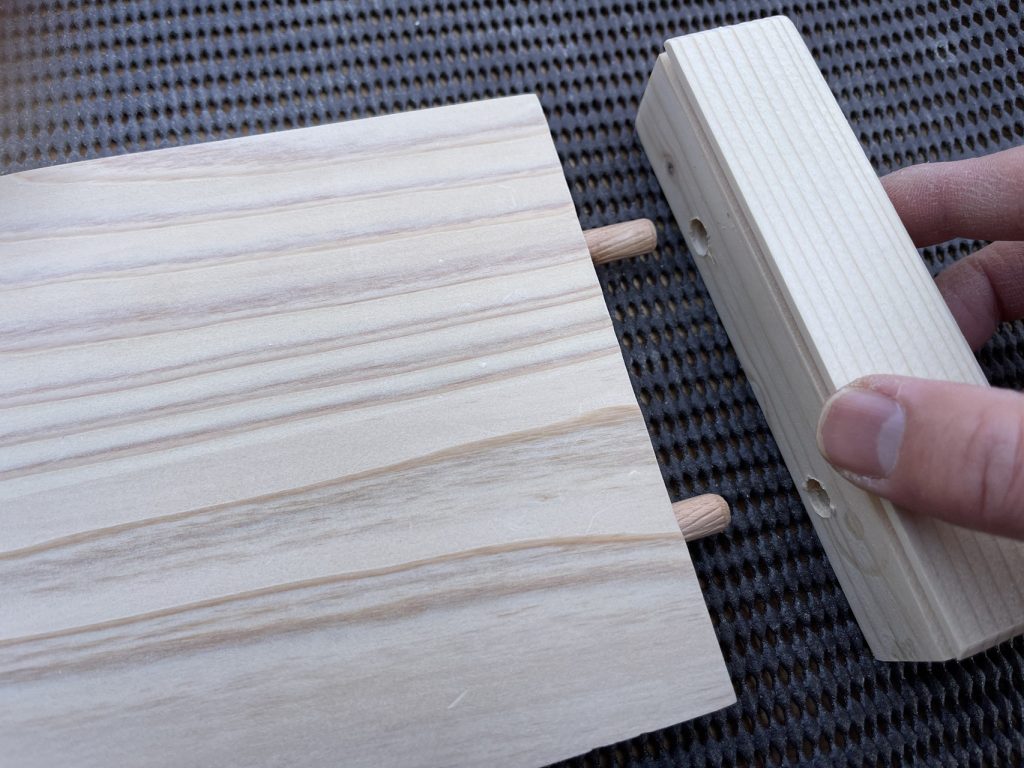 背板の両サイドにダボを入れて上下のパーツを接着し、しっかりクランプで止めます。