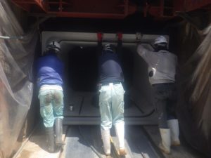 あとは、エアーバックに空気を送り込むと、エアーバックが膨らみ、ボックスカルバートが少し上がれば3人の力で、6.8tのボックスカルバートを押して設置場所まで、移動し設置します。