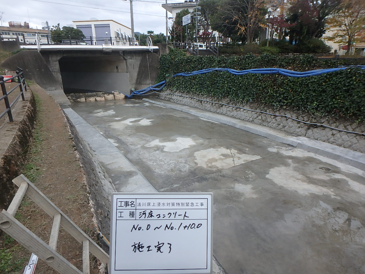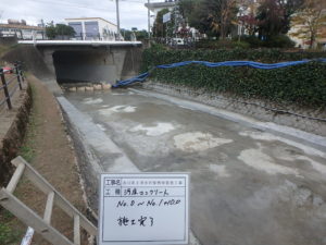 川底を掘って、コンクリートを打っていく水害対策の工事です。